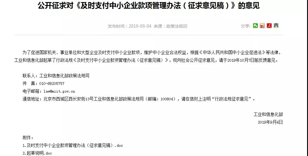 2019年9月,工信部發(fā)布《及時支付中小企業(yè)款項(xiàng)管理辦法(征求意見稿)》,提出: