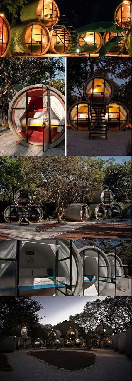 水泥管層疊起來(lái)加上玻璃和綠植