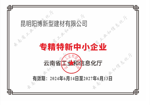 近期,云南省工業(yè)和信息化廳公布了2024年專精特新中小企業(yè)認定名單,昆明陽博新型建材有限公司成功入選。